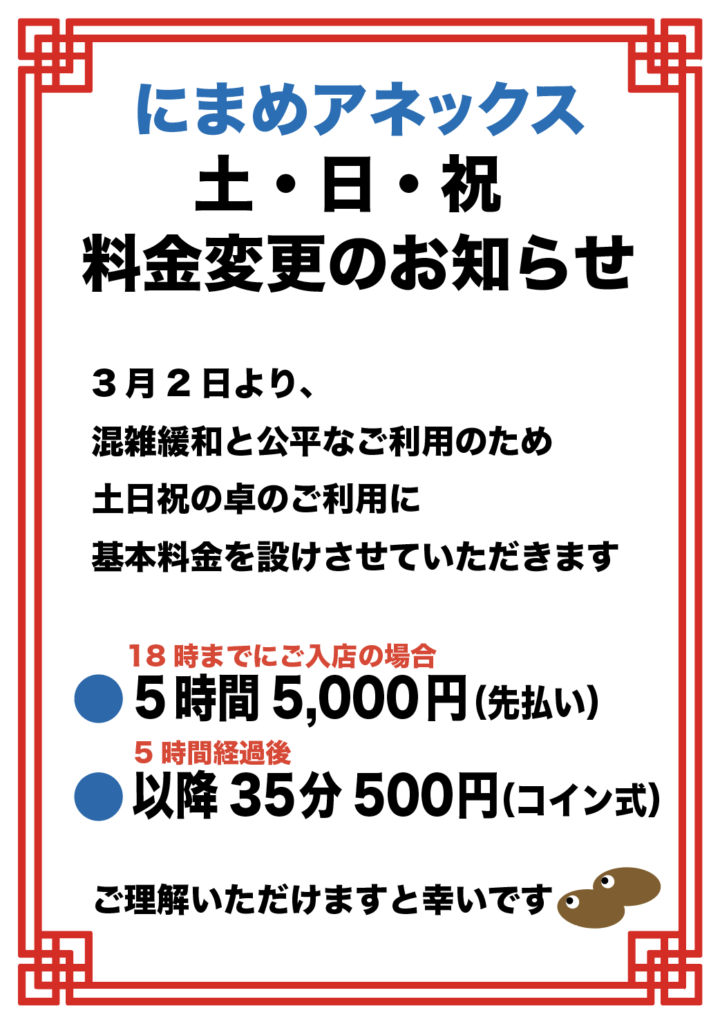 貸卓専門にまめアネックス 卓利用基本料金のお知らせ